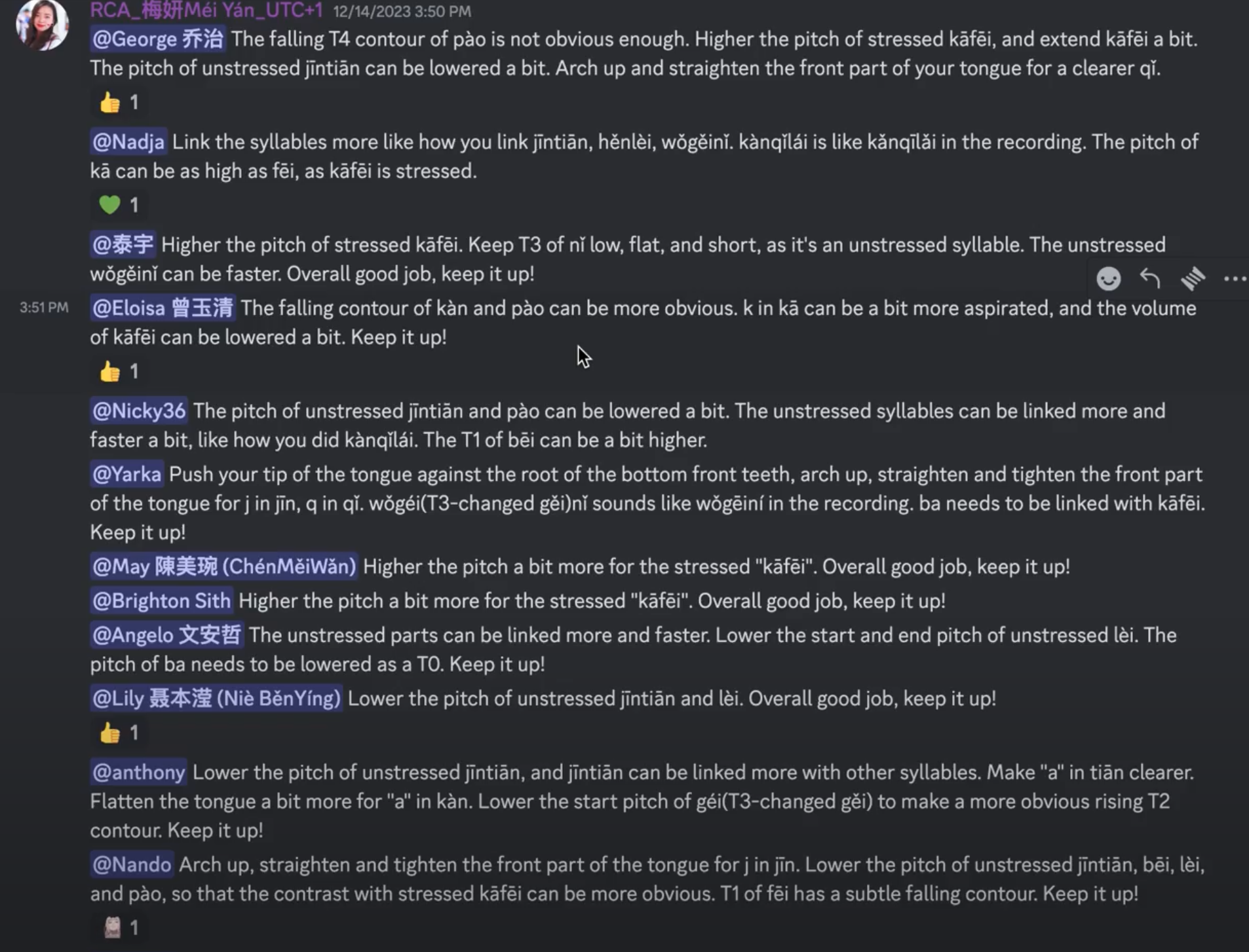 “I love everything in Rita’s pronunciation course, from the comprehensive logically-arranged bite-size lessons to the straightforward exercises, the meticulous feedback from the kind Laoshi team, the weekly livestreams during which Rita gave attentive and patient one-on-one guidance, and also to the Discord group which provides more insights through discussions and QAs.