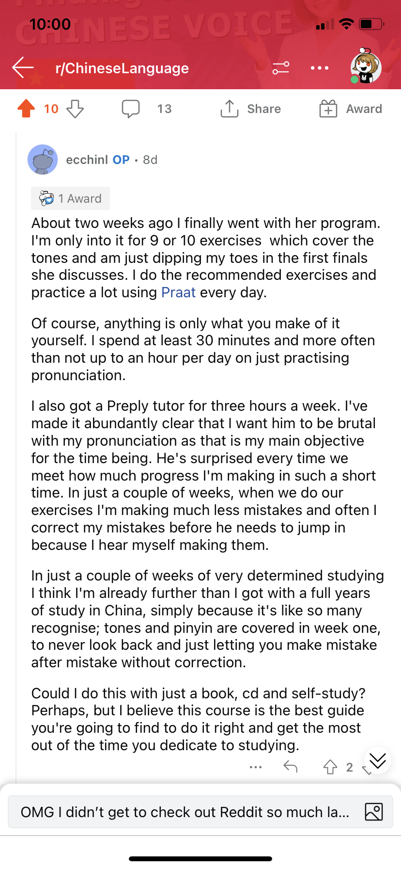 “The feedback given has been so detailed and helpful, causing me to uncover so many important things that I missed during my self-paced journey. Normally you might think that receiving such detailed pronunciation information would be tedious and frustrating, but it has been not only helpful, but actually fun and engaging.