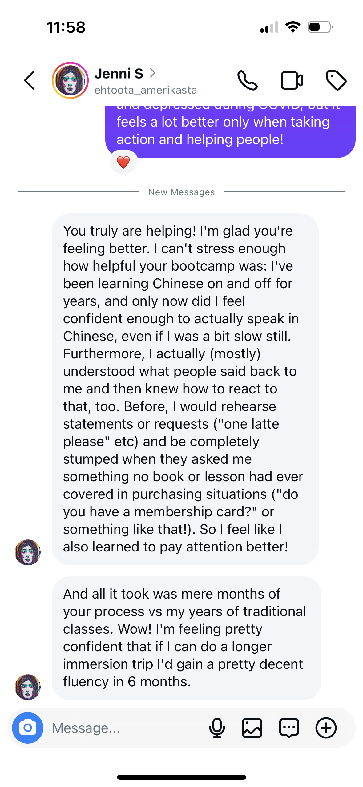 “I spent 4 months doing the course on my own and then I also did the boot camp. All of my Chinese speaking partners have noticed the difference from before and I have met so many new clients and Chinese members of the community to talk with. Everyone is so surprised I have only been studying for less than a year and that I have never been to China.