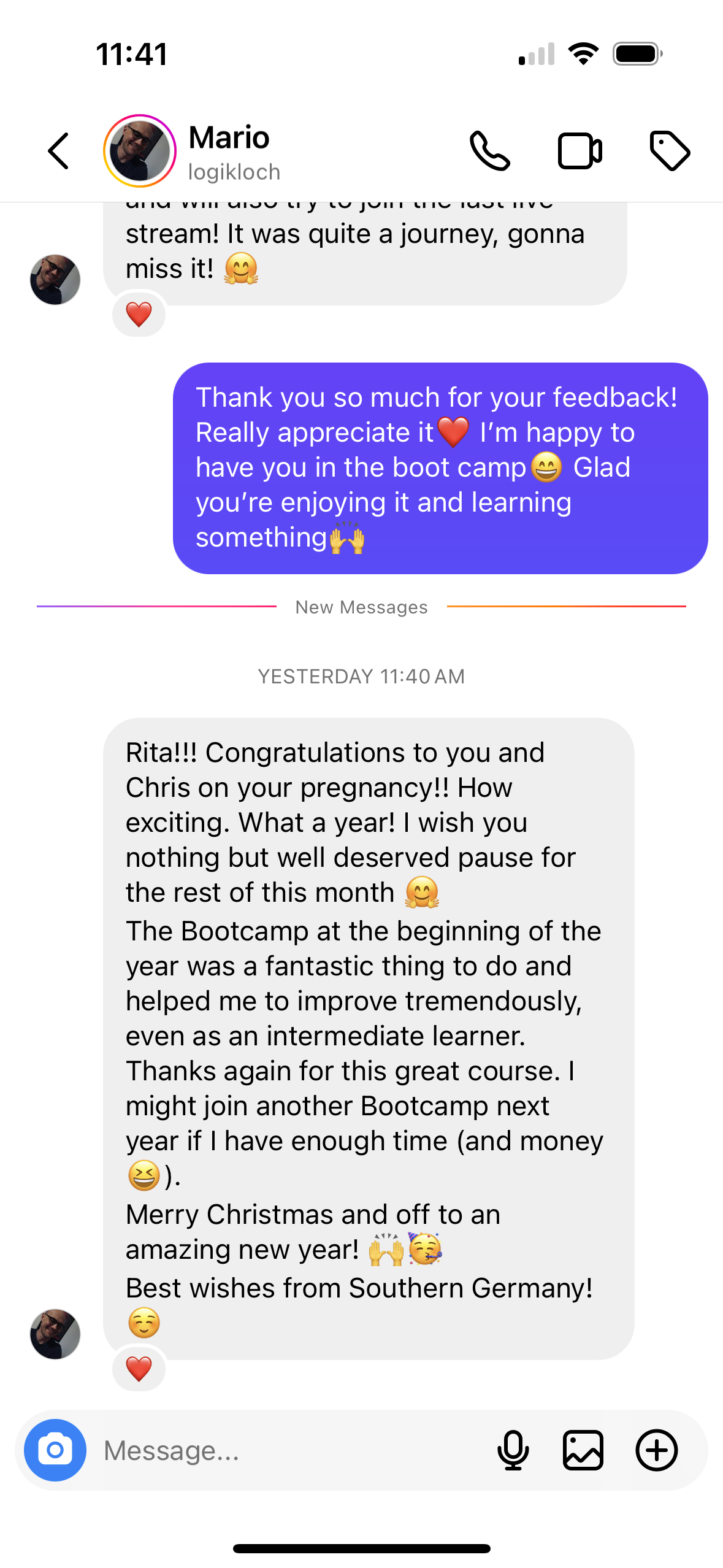 I appreciate the help and encouragement of the other students in this group. There is a great feeling of camaraderie and no judgment, which a newbie like me really welcomes and cherishes. And it goes without saying that the tolerant, but always direct and helpful feedback from the teachers on the Daily Missions is worth its weight in gold! If it wasn’t for that, I might have given up near the start!”